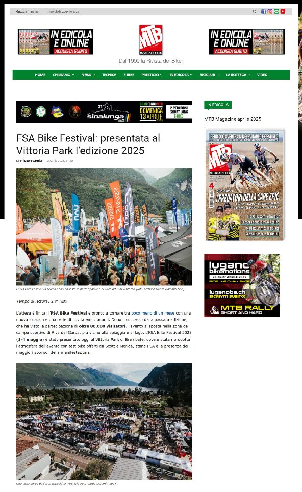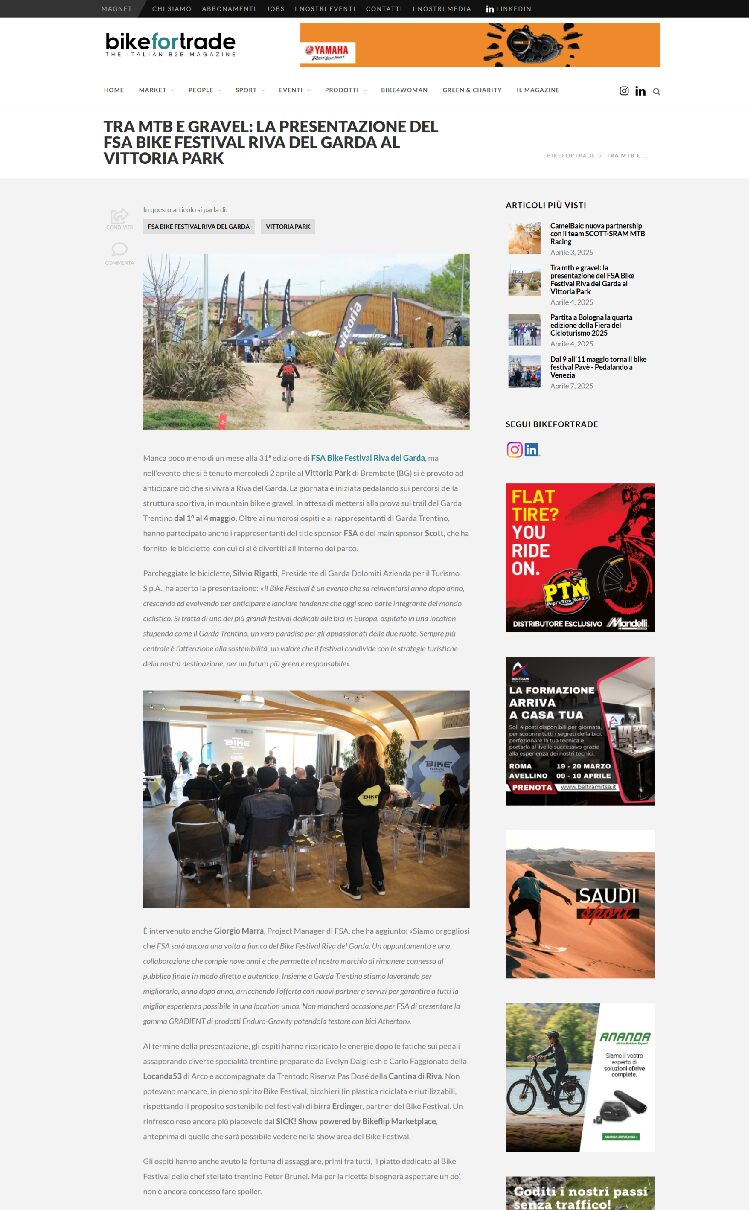 With just under a month to go until the 31° edition of the FSA Bike Festival Riva del Garda, a select group of media were sent to a preview to reveal what the event has in store for its visitors, with an event held on Wednesday 2 April at Vittoria Park in Brembate (BG). Guests had the opportunity to pedal on the Vittoria Park trails, putting the bikes and tracks provided to the test. After a short break to refresh themselves, the presentation took place, where one by one the novelties of the 2025 edition were shown. To close, the guests were able to have a taste of specialties from Trentino, which will be featured on the festival menu. In addition to the numerous guests and representatives of Garda Trentino, representatives of title sponsor FSA and main sponsor Scott, who provided the bicycles with which they pedaled around Vittoria Park, also participated.