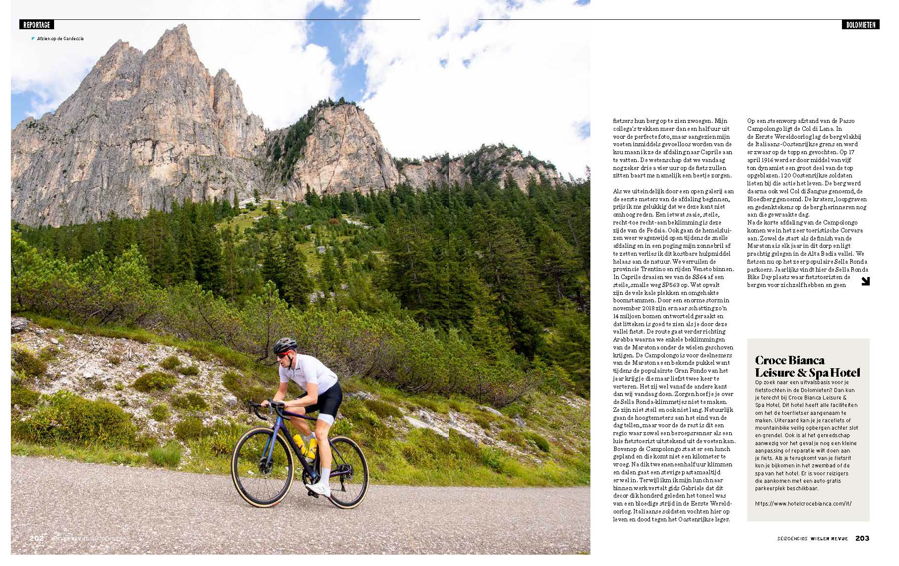 Cycling is the new in thing for the hotel industry, especially in areas with a strong cycling culture like for example the Val di Fassa in Trentino, Italy. Here the Croce Bianca Leisure & Spa Hotel offers cycling enthusiasts all kinds of different services to enjoy a worry-free cycling holiday. To become internationally known, in addition to the well known routes around the village of Canazei and in the Valley, the hotel invited some journalists from the most commonly known newspapers from around the world for a press trip. Through which it was able to bring to light, in the midst of many similar offers and proposals, the real advantages of the Roadbike package holiday that the hotel offers as well as the integrity of the bike tours offered. The guests who attended, in turn, wrote about their experience in various specially dedicated articles that were generally spread over several pages.