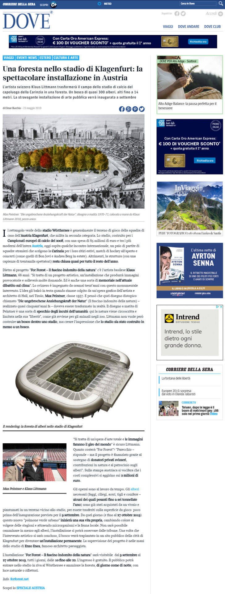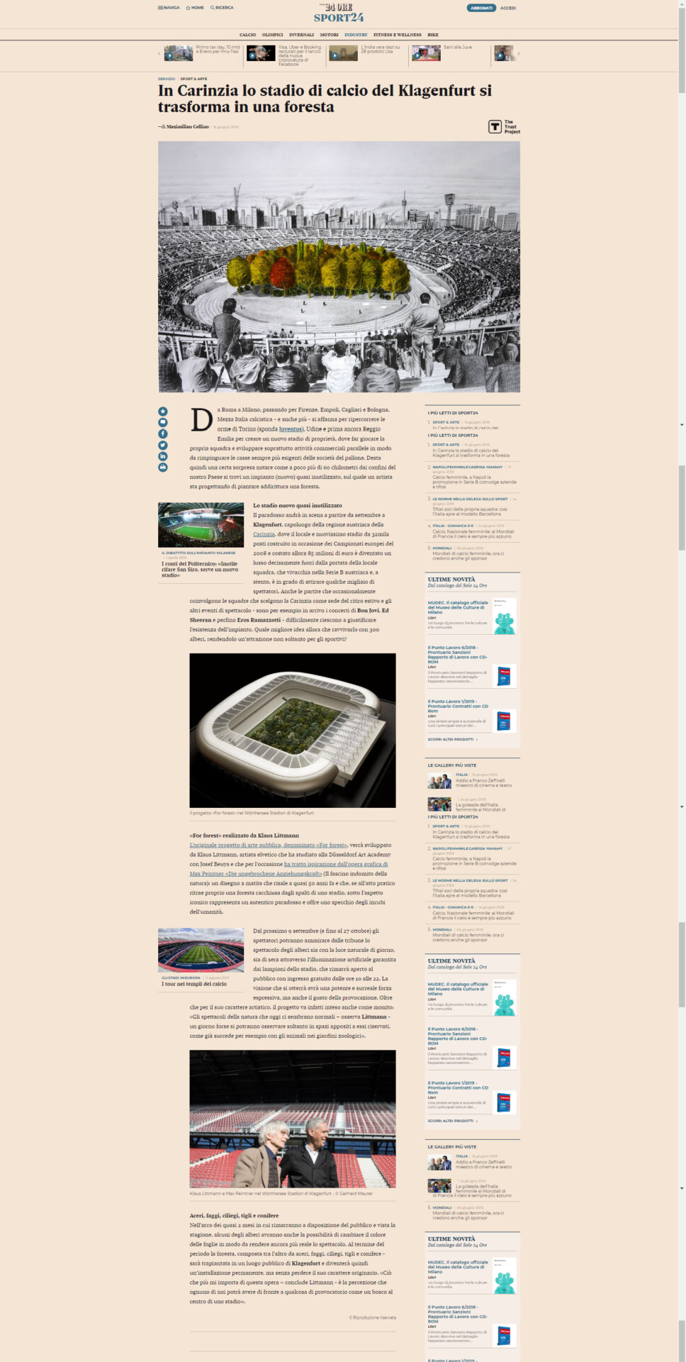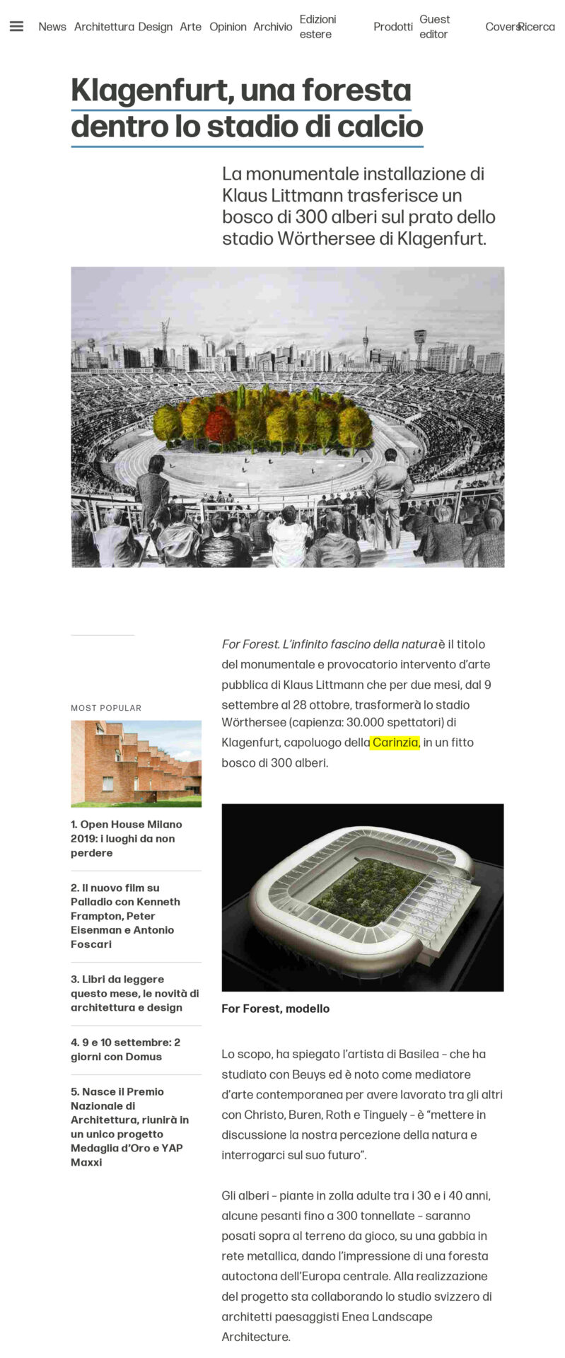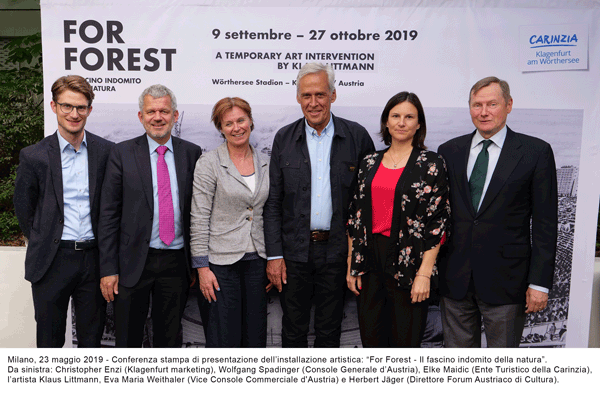 Nell’autunno 2019 l’artista elvetico Klaus Littmann ha firmato “For Forest”, un’installazione temporanea con cui ha raccolto 299 alberi all’interno dello stadio cittadino Wörthersee di Klagenfurt, in Carinzia (Austria), con lo scopo di sensibilizzare sul rapporto uomo-natura. Un progetto di forte impatto emozionale che ha tradotto in realtà l’opera grafica di Max Peintner “The Unending Attraction of Nature”. Si è trattato del più grande progetto artistico mai allestito in Austria in uno spazio pubblico e ha avuto una copertura mediatica internazionale in oltre ottanta Paesi. In Italia, l’Agenzia ne ha curato la presentazione ai media, con particolare cura di ogni aspetto: la scelta di una location in grado di trasmettere la percezione della foresta, traduzione simultanea, interviste personalizzate con l’ideatore dell’opera.