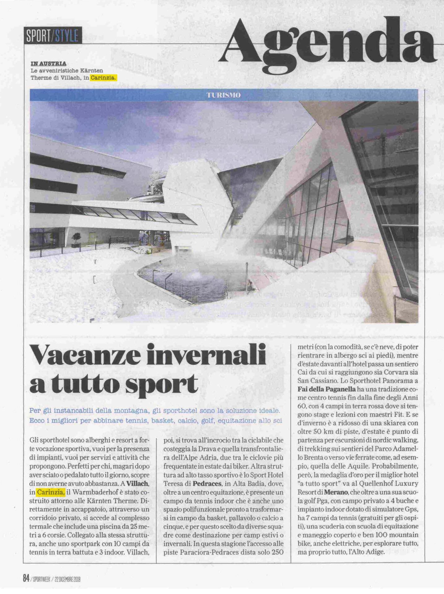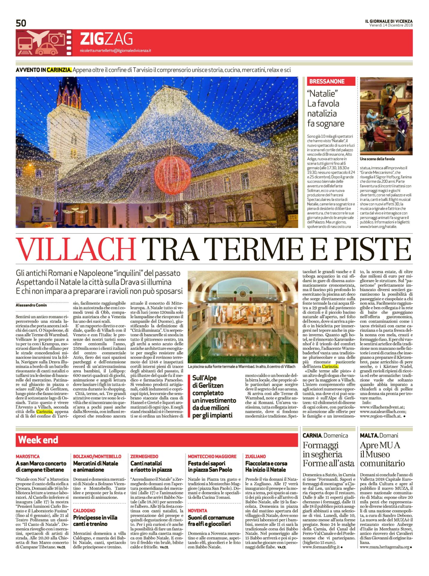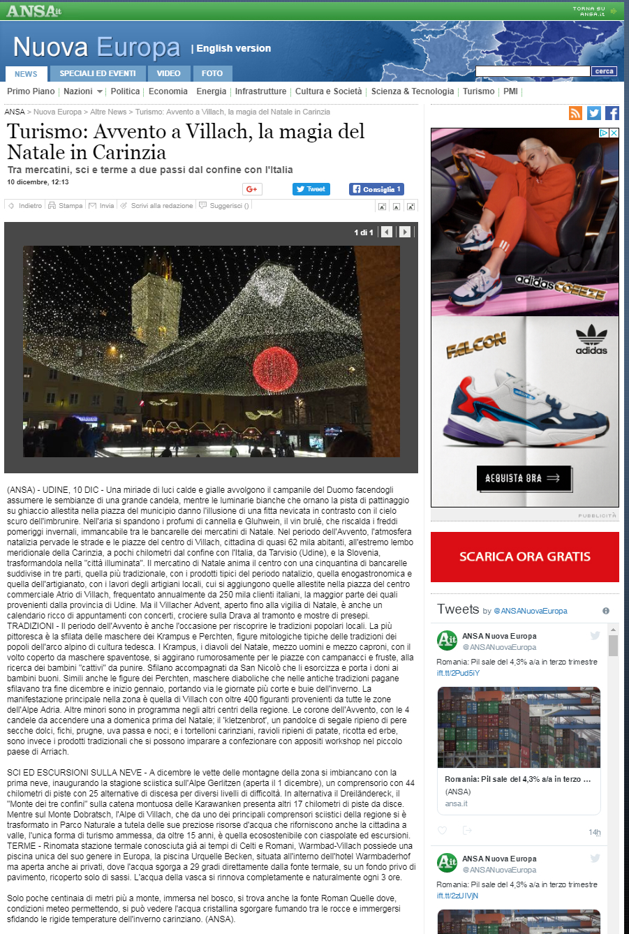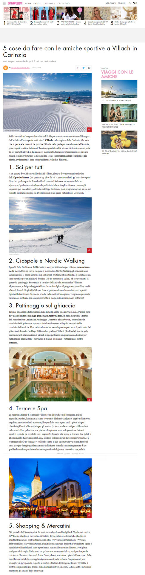 Un viaggio stampa per far conoscere l’offerta turistica legata ai tradizionali Mercatini di Natale di Villach (in Carinzia, Austria). L’Agenzia ha diversificato varie attività, in modo da presentare un’offerta turistica invernale davvero ampia: sci e sport della neve, cene tipiche, active-life alle terme, con una lezione di Aqua-Fit presso l’area fitness delle Kärnten Therme, oltre a una nuotata nella piscina naturale posta direttamente sulla fonte termale. Spazio anche alla cultura, con visite ai centri di maggior interesse storico della cittadina, e alle tradizioni, con la partecipazione alla sfilata delle popolari maschere dei Krampus. Senza dimenticare, essendo sotto Natale, lo shopping natalizio.
