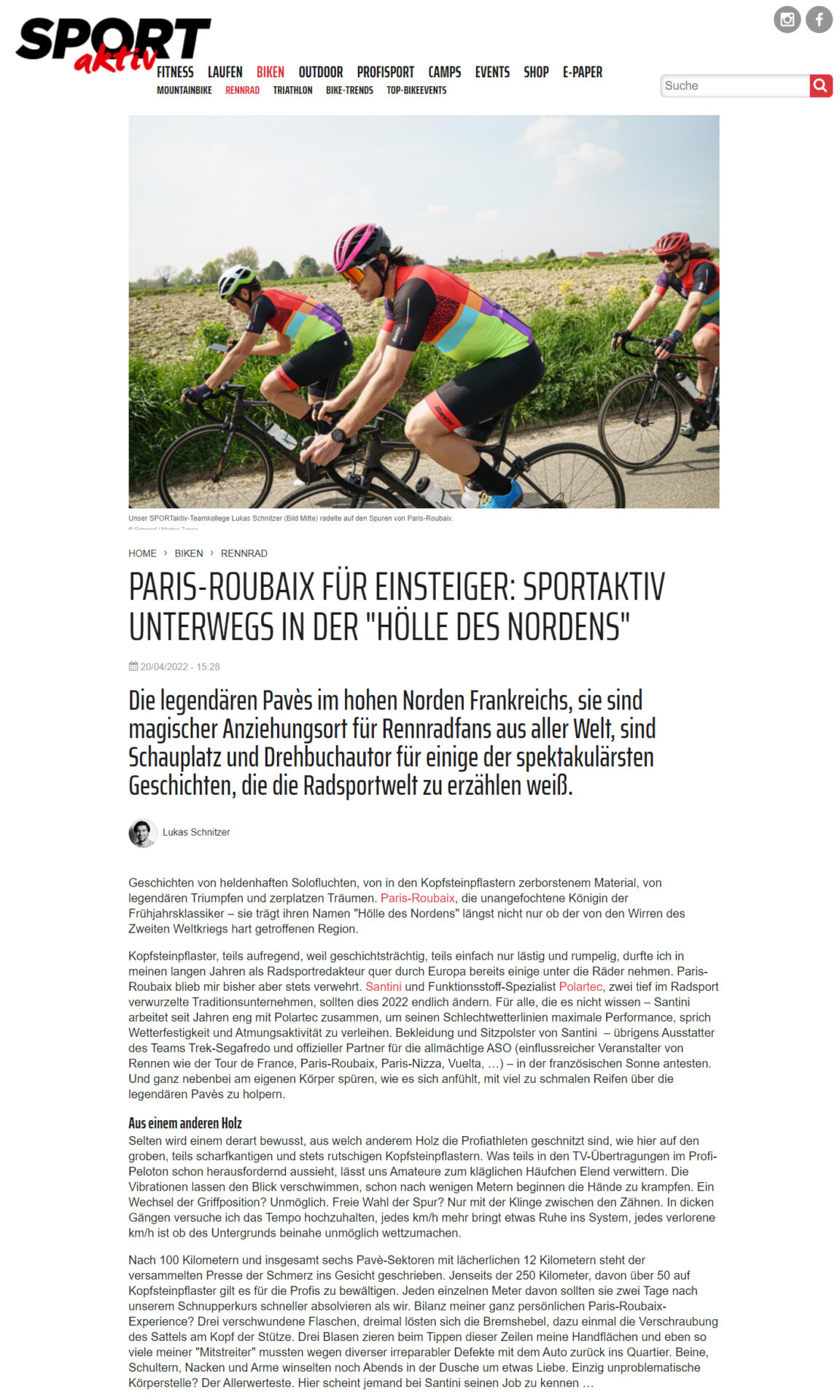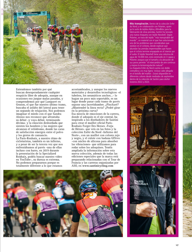 Un Media Event internazionale organizzato in occasione della Paris-Roubaix 2022, per presentare in anteprima la collezione Santini dedicata alla famosa “Regina delle Classiche”. Una linea che il maglificio sportivo ha disegnato in omaggio alla partnership con ASO (organizzatore della competizione) e Polartec (fornitore strategico di Santini). La collezione è stata spiegata nelle sue specifiche tecniche a undici giornalisti di settore provenienti da tutta Europa. Successivamente, sono stati accompagnati in un test sul campo, con la possibilità di pedalare su nove tratti dell’iconico pavé nonostante l’imminenza della gara. Gli ospiti hanno poi potuto assistere alla corsa dei professionisti.